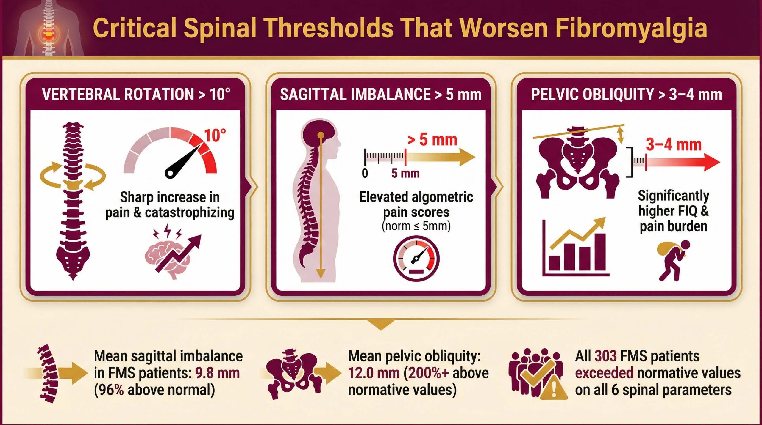This establishes a direct, quantifiable link between mechanical spinal failure and the central nervous system dysfunction characteristic of FMS.
