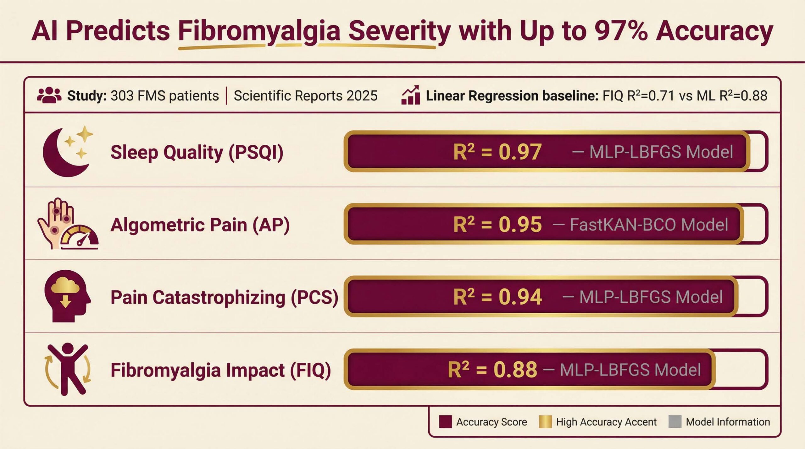Figure 1: Machine learning models predicted fibromyalgia symptom severity with up to 97% accuracy using only 3D spinal measurements. Source: Moustafa et al., Scientific Reports 2025.