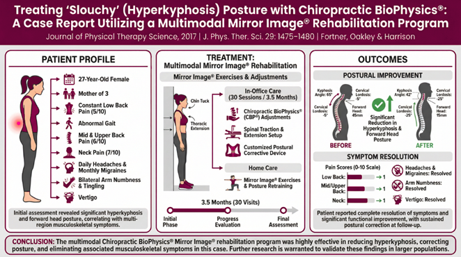 Fortner MO, Oakley PA, Harrison DE. “Treating ‘slouchy’ (hyperkyphosis) posture with chiropractic biophysics®: A case report utilizing a multimodal mirror image® rehabilitation program.” J Phys Ther Sci. 2017 Aug;29(8):1475-1480.